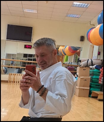 In 2011, I was trying to pass a karate test for the 2nd dan. This is a master’s degree; the 1st dan is the black belt qualification. Before that, you have to ascend from 10th kyo to 1st kyo, which are pupil’s degrees. In colours, you travel from white belt to yellow belt to blue belt to brown belt – in my karate style. Some styles have intermediate red, green or even orange belts. It really doesn’t matter, though.